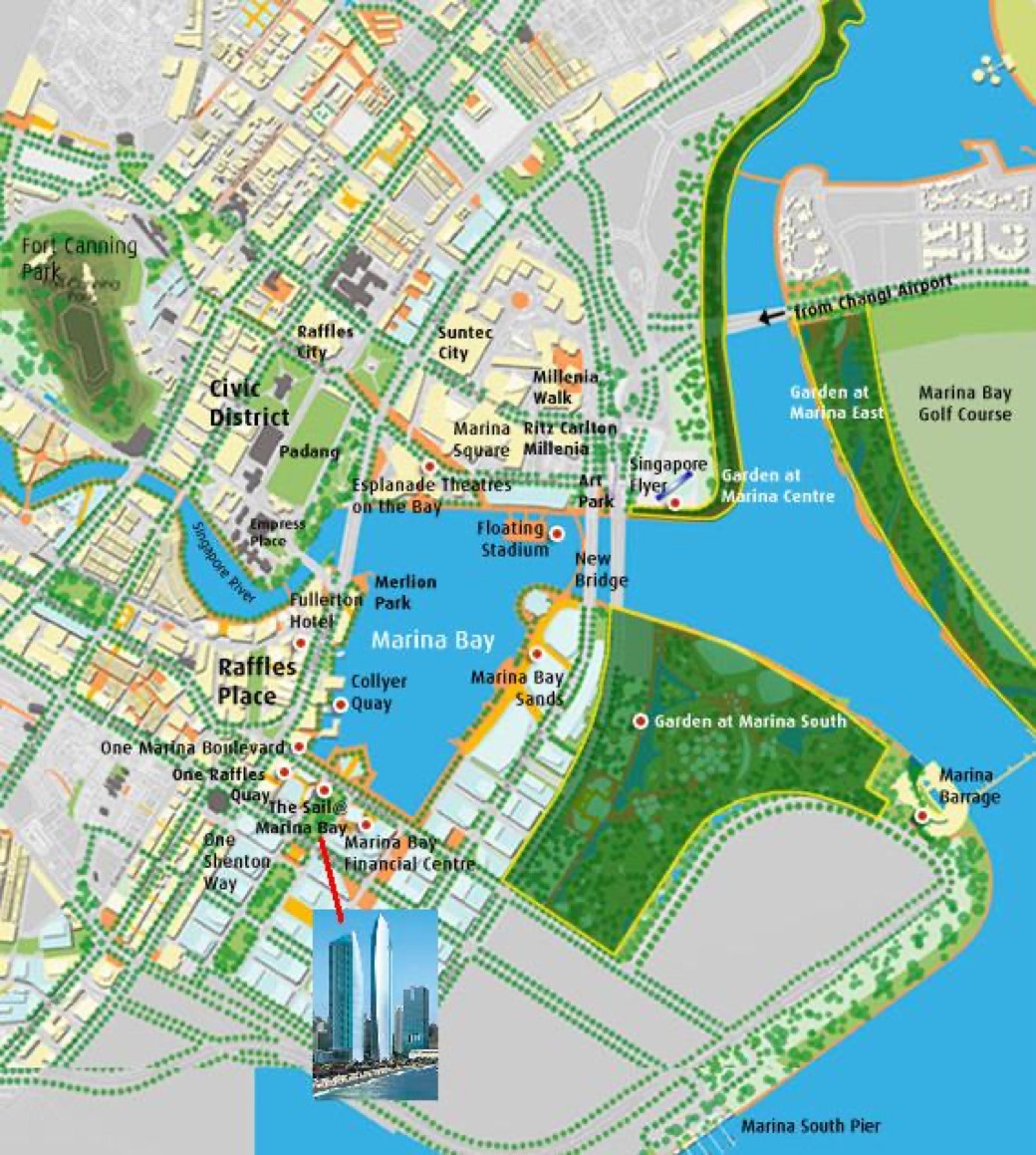This exceptional development is strategically located in the New Downtown at Marina Bay, the Marina Bay Financial Centre (MBFC), Raffles Place and near notable landmarks such as The Esplanade - Theatres on the Bay, Merlion Park, Singapore Flyer, Marina Bay Sands Integrated Resort, and the Gardens by the Bay (total 94 ha).